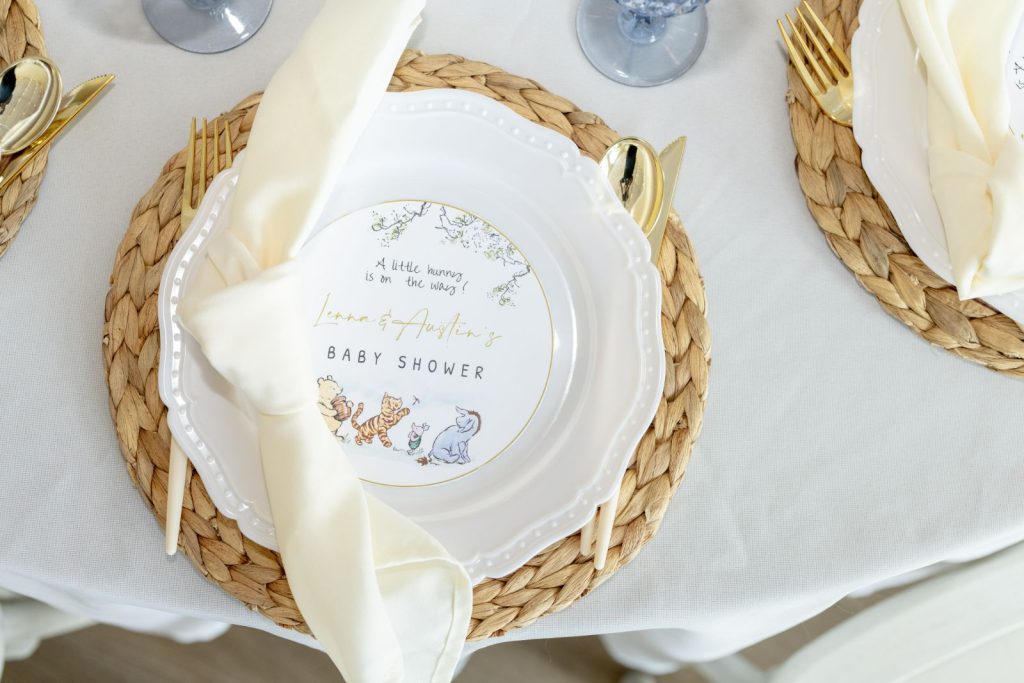 - Tableware: Charger plates (gold, black, or silver)