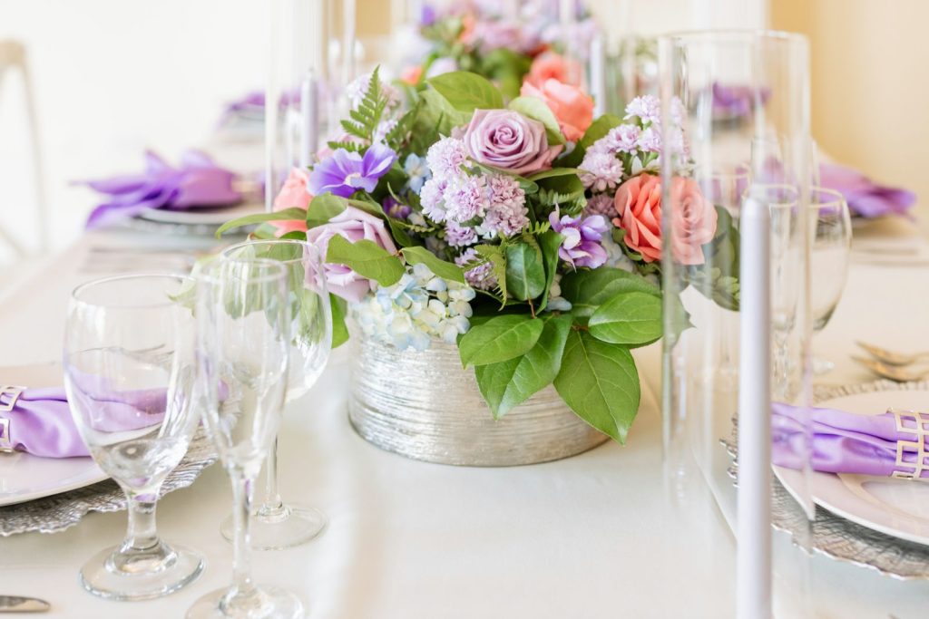 - Table Styling: White floral centerpieces • Black, white, or ivory linens